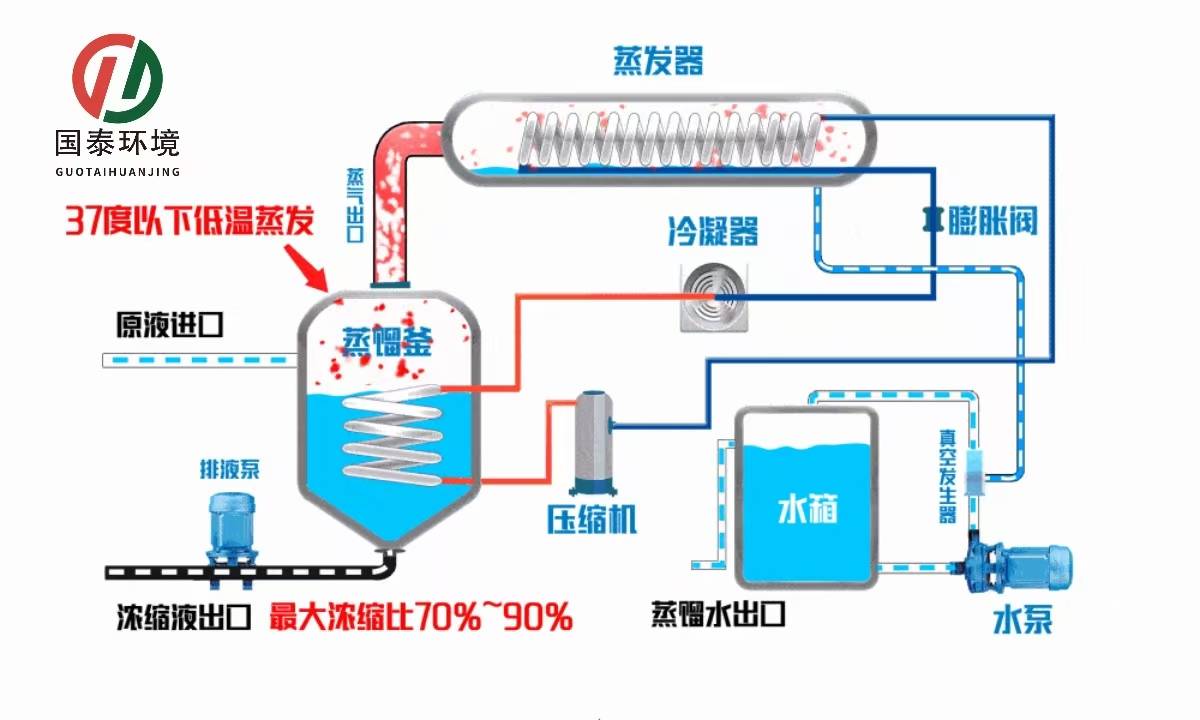 浓缩液排出:一个蒸发周期完成后,压缩泵停止工作,浓缩液管路气动阀打开,蒸发罐加压,将浓缩液压入浓缩桶内。